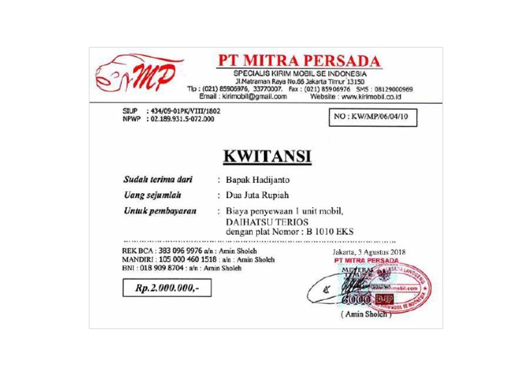 Kwitansi adalah tanda bukti transaksi penerimaan sejumlah uang pt kwi. Kwitansi sangat diperlukan oleh setiap orang untuk pembuktian sebuah pembayaran, biasa kita. Alhamdulillah telah dipercaya ratusan instansi pemerintah & dkm. Kwitansi pembayaran sewa bus contoh kwitansi pem. Dikeluarkan dan ditanda tangani si penerima, kemudian diserahkan kepada si pemberi uang atau yang membayar.